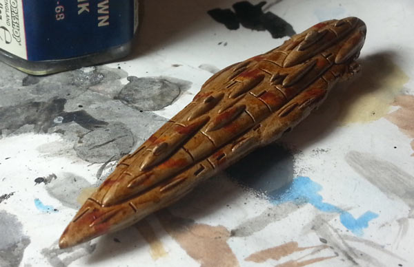 Wash the model in a brown wash to get the dark colour into the recesses of the model. Pick out the pattern again.