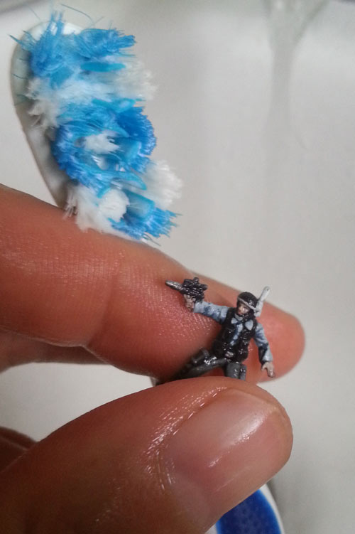 The Blue was given a base coat of Imperial Blue highlighted with a light drybrush of Imperial Blue + White in a 1:1 mix.