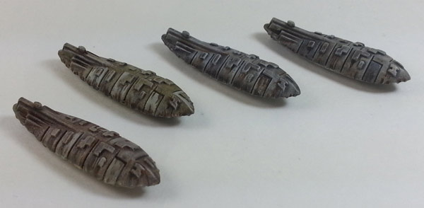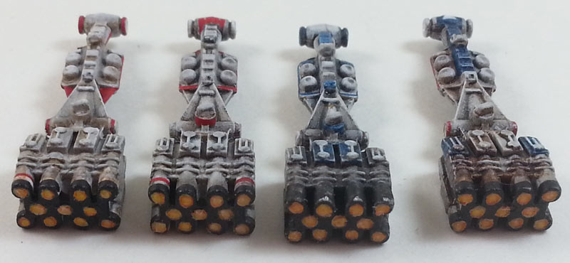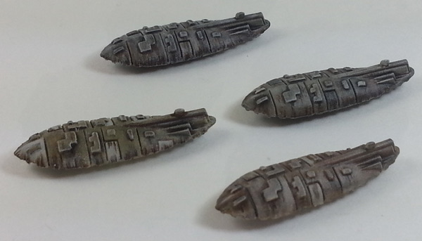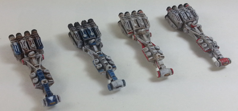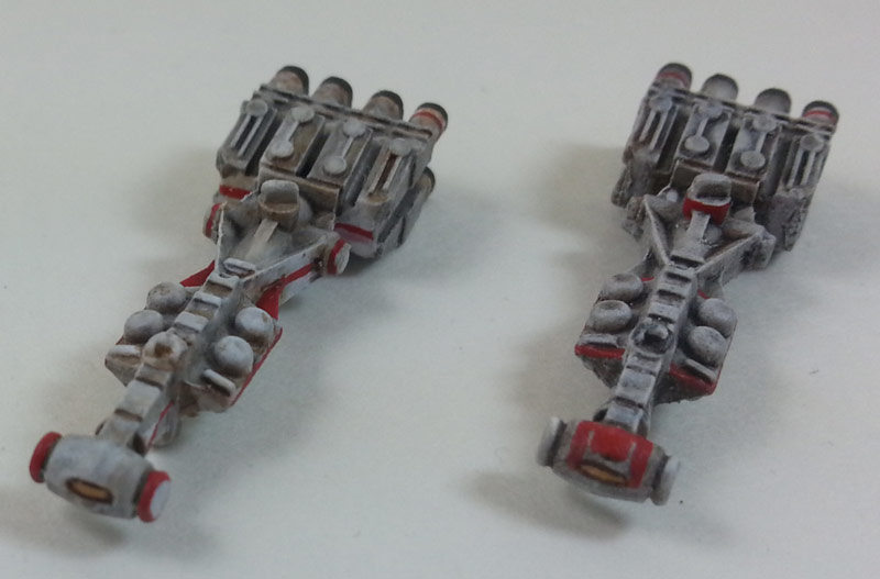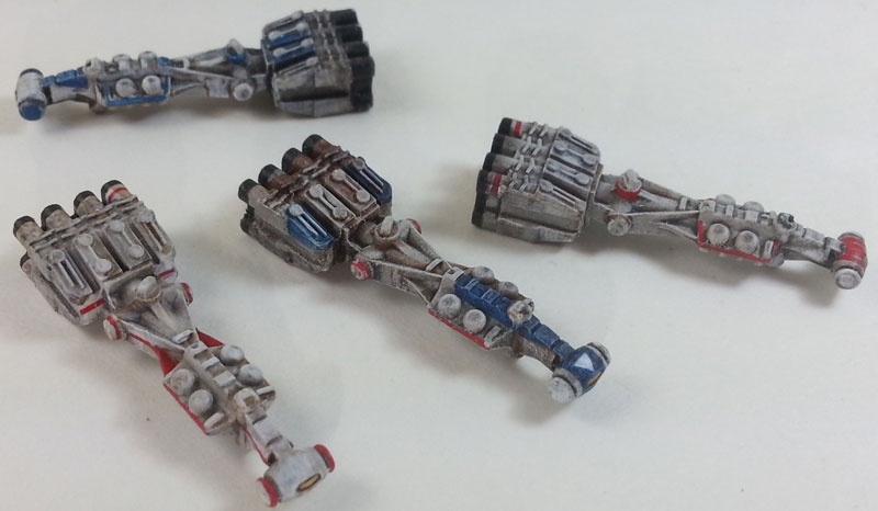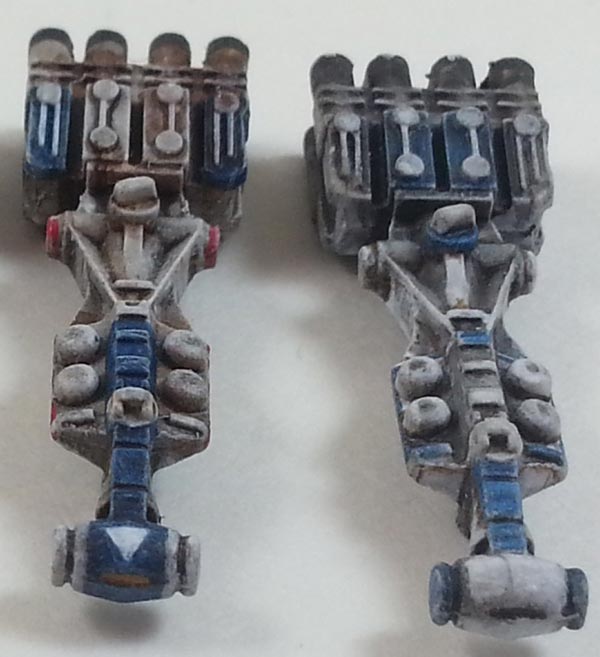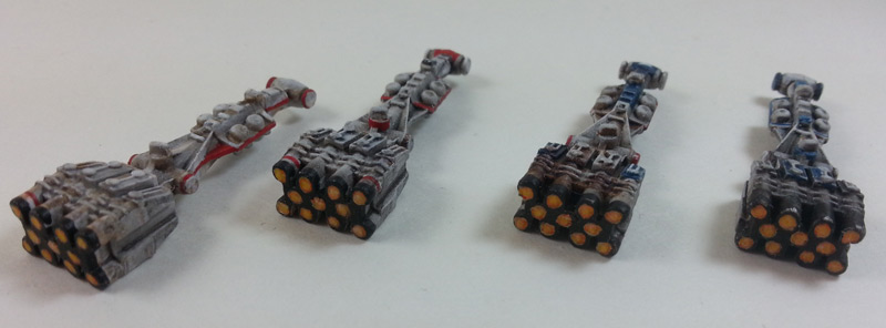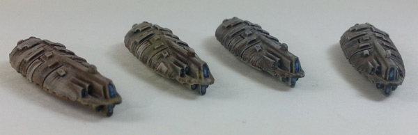 The engines were also painted in blue with a light blue highlight to give the models some detail. Each Rebel Transport looks fairly unique, yet because I used earth tones and grey, they do not clash with the rest of the Rebel Fleet.