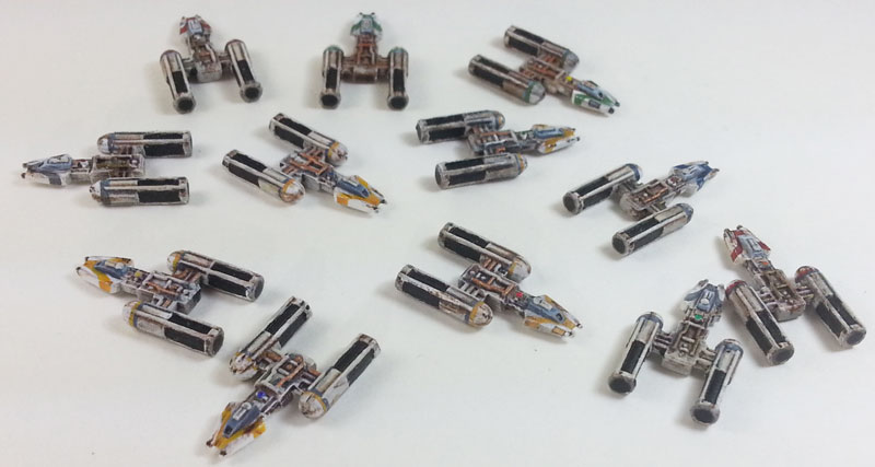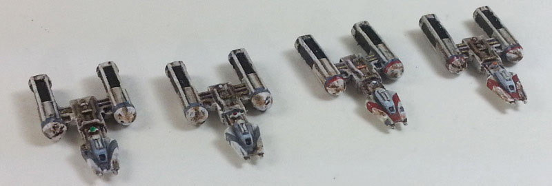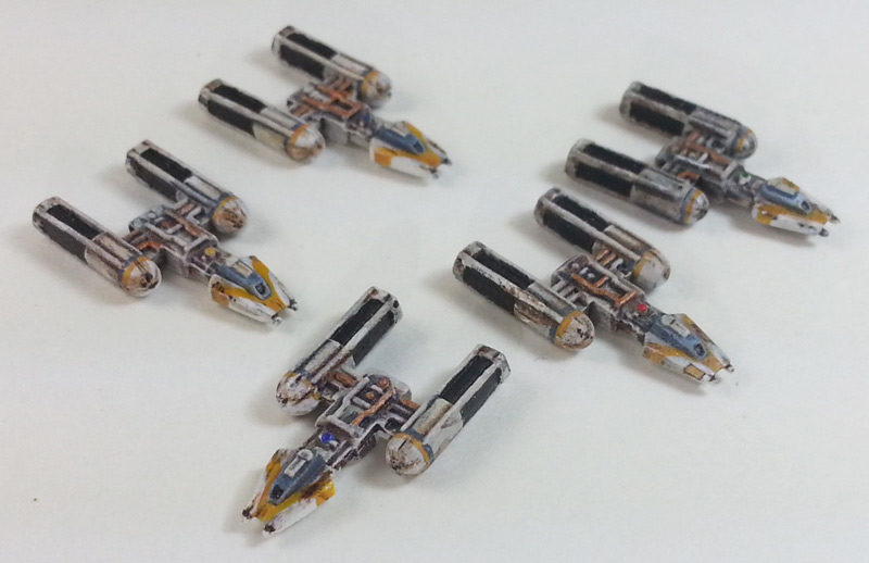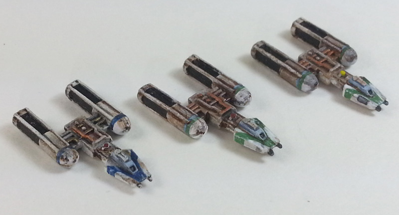 The yellow stripes were in Bronze Fleshtone. For the Green Y-Wings I used Intermediate Green. I don’t have notes on the blue or red I used for the Blue and Red Squadron Y-Wings.